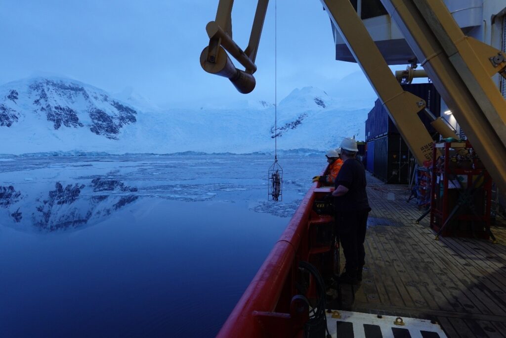 Figure 3: In situ mini Bongo net (+Niskin and CTD) deployments in Ryder Bay and Le Mer Channel onboard the SDA during SD049 to collect zooplankton samples and oceanographic variables.