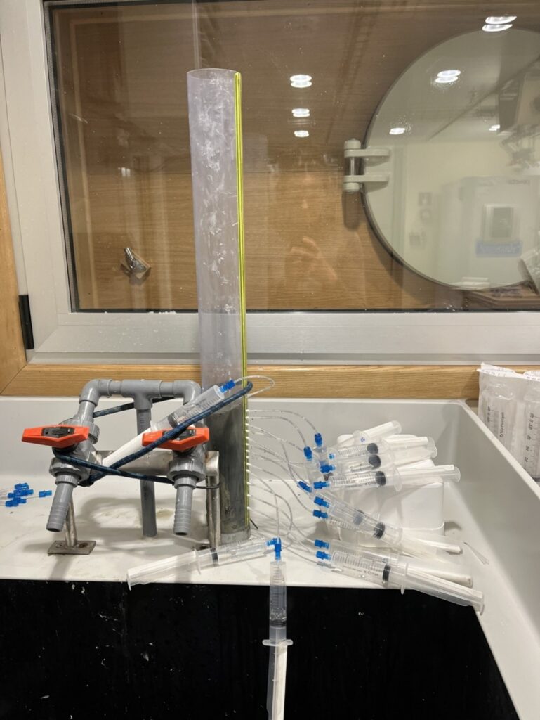 Figure 2: Sediment core pore water extraction. A core sampled close to the glacier is filtered for dissolved nutrients and metals using rhizon filters (cred. Rhiannon Jones)