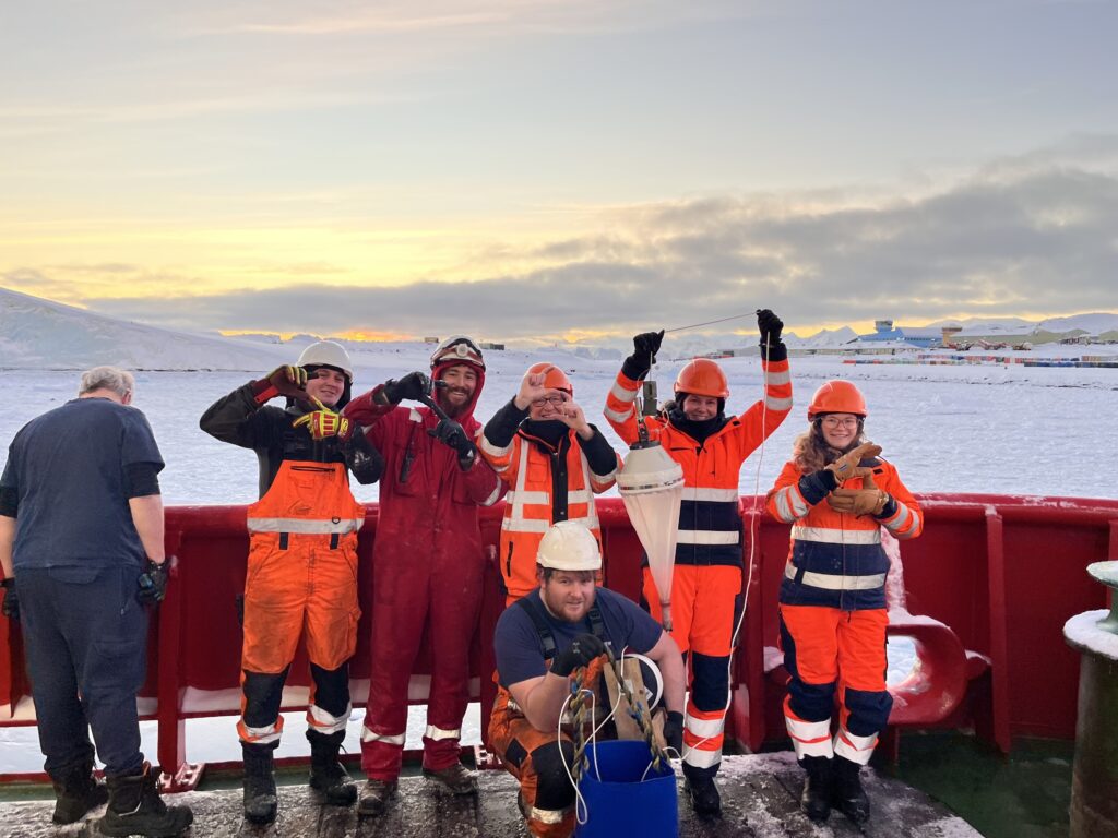 Figure 2:In situ mini Bongo net (+Niskin and CTD) deployments in Ryder Bay onboard the SDA’s Terror during SD049 to collect zooplankton, nutrient and oceanographic samples.