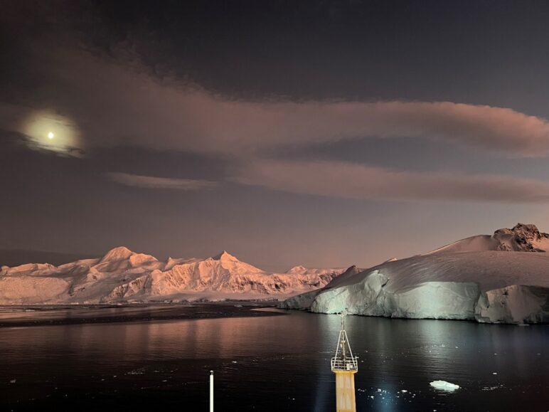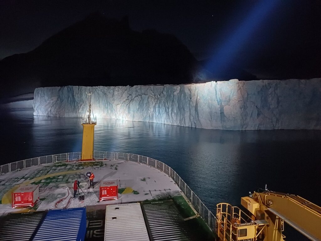 Antarctic glaciers strongly influence the ocean, providing freshwater and nutrients to the sea when they melt, and pushing up sea levels globally. They are also vulnerable to ocean warming, becoming more unstable and calving more frequently. To understand better how these key processes work, and what are their implications for climate, sea level rise and ocean ecosystems, we ventured to the Antarctic on the UK polar research vessel RRS Sir David Attenborough. This was a rare wintertime expedition, during which we surveyed a number of glaciers and measured the ocean adjacent to them, often in darkness and in frigid temperatures. The photo was taken during this wintertime campaign, in a key location called Börgen Bay on the Antarctic Peninsula. The glaciers here are retreating rapidly, linked to strong warming in the ocean and atmosphere. Our measurement campaign involved manoeuvring the ship close to these glaciers, so that oceanographic instruments could be deployed at the same time as determining the glacier characteristics. The photo shows the ship’s searchlights picking out features of the William Glacier in Börgen Bay, while scientists and field staff observe. A dramatic calving of this glacier was observed later the same night. Photo taken in May 2025 with an iPhone 16 Pro Max on standard Photo setting. No post-processing applied.