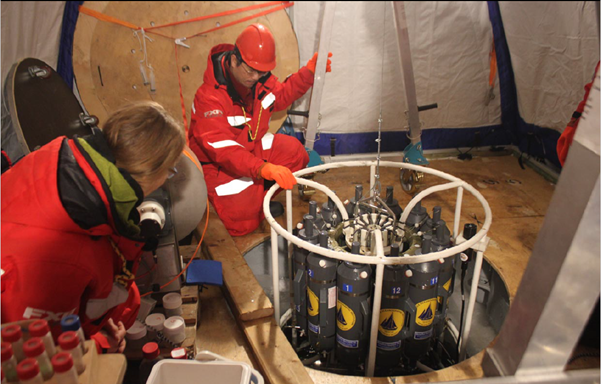 Cover Image: Scientists retrieving seawater from different depths using a carousel water sampler deployed through a hole in the sea ice, sciencevega pg.07